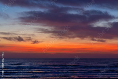 © sebi_2569, Naklejka premium A scenic view of a dramatic sunset or sunrise over the ocean, with vivid orange, red, and purple hues reflecting on gentle waves