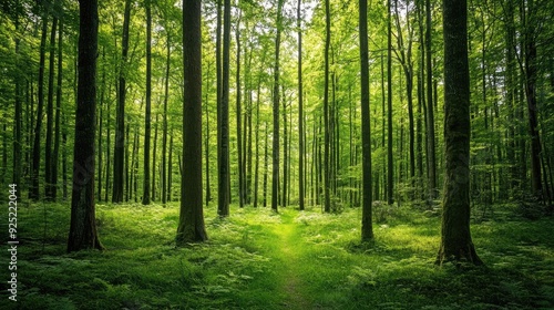 © savittree, Fototapeta premium A scenic view of a forest filled with deciduous trees, the fresh green leaves creating a vibrant, natural environment