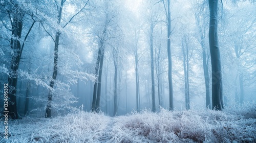 © Prism Trail, Naklejka premium A scenic view of a frosted forest in a misty winter season
