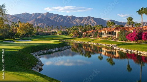© Sampao, Fototapeta premium A scenic view of a golf course overlooking a tranquil lake.