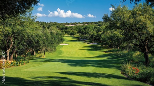 © Theeranan, Naklejka premium A scenic view of a golf field with well-manicured green grass and lush woods surrounding the area.