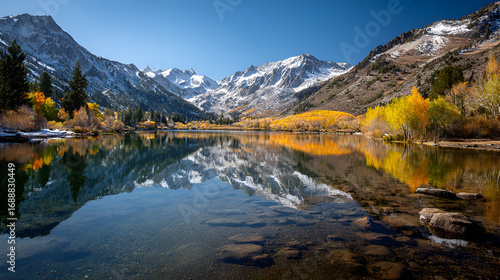 Fototapeta premium A scenic view of a lake reflecting snow capped mountains and autumn trees under a clear blue sky