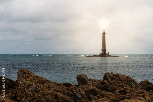 © Monodio Photography, Fototapeta premium A scenic view of a lighthouse built on water near the shore with the sun shining brightly on top of it