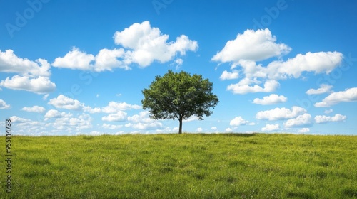 © phattharabodin, Obraz premium A scenic view of a lone tree in the middle of a grassy field, with a clear blue sky and fluffy white clouds overhead.