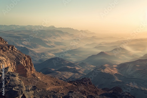 © Fotograf, Fototapeta premium A scenic view of a mountain range during sunset with warm orange and pink hues