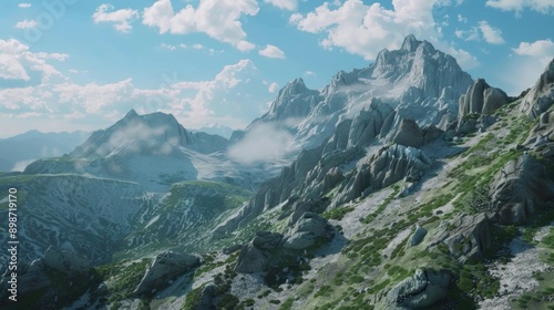 Fototapeta premium A scenic view of a mountain range with clouds in the sky, suitable for use in...