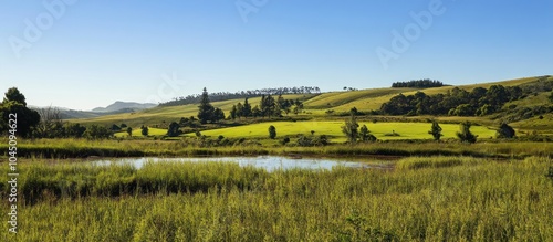 © Fana Art, Obraz premium A scenic view of a pond in a valley surrounded by rolling hills.