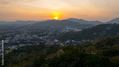 © Narong Niemhom, Obraz premium A scenic view of a town nestled among lush green mountains at sunset, with a temple structure perched on the hillside and a vibrant orange sky creating a warm, tranquil atmosphere.