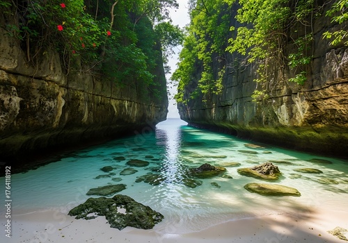 © motiva_dsgn, Naklejka premium A scenic view of a tropical beach with clear turquoise water flowing between rocky cliffs covered in lush green vegetation.