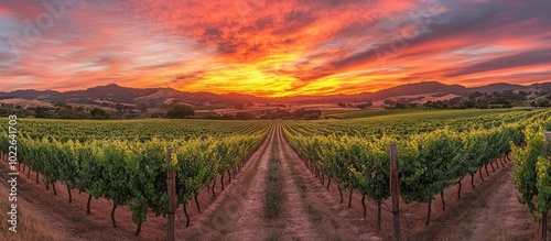 Fototapeta premium A scenic view of a vineyard at sunset, with rows of grapevines leading to a vibrant sunset sky.
