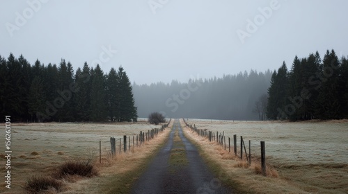 © CStock, Naklejka premium A scenic view of a winding road surrounded by misty trees and a tranquil landscape evokes a sense of calm and solitude.
