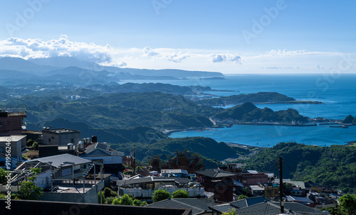 © twabian, Fototapeta premium A scenic view of Jiufen Village with green mountains stretching to the blue sea, under a blue sky with white clouds. The picturesque afternoon landscape. Jiufen, Taiwan.