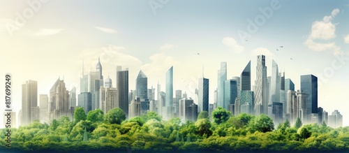 Obraz premium A scenic view of lush green trees harmoniously blending with the modern structures of the cityscape creating a vibrant copy space image