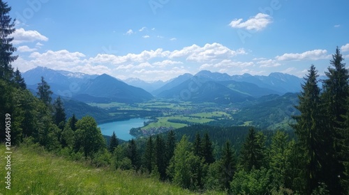 © gentho, Fototapeta premium A scenic view of mountains and a lake under a clear blue sky.