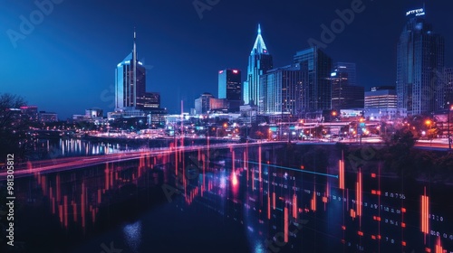 Obraz premium A scenic view of Nashville's Broadway over the river at night, illuminated by...