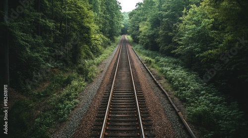 Fototapeta premium A scenic view of railway tracks through a dense forest with a clean, open...