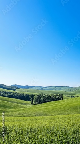 © Gummyz, Naklejka premium A scenic view of rolling green hills under a clear blue sky