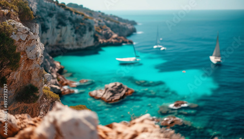 © abu, Fototapeta premium A scenic view of rugged coastal cliffs with crystal-clear turquoise waters below and a few small sails
