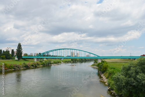 Naklejka premium A scenic view of the Green Railway Bridge, also known as Hendrix Bridge, spans the Sava River in Zagreb, Croatia, under a partly cloudy sky