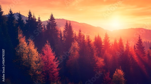 © PSCL RDL, Naklejka premium A scenic view of the sun setting over a forest of colorful autumn trees, casting warm orange and pink hues in the sky.