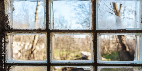 Naklejka premium A Scenic View Through a Beautiful Frosted Glass Window in a Rustic and Cozy...