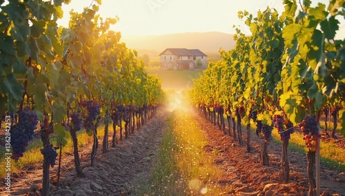 Naklejka premium A Scenic Vineyard at Sunset featuring Lush Grape Vines and Beautiful Nature...