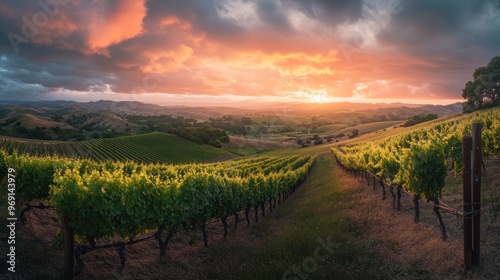 © BerkahStock, Fototapeta premium A scenic vineyard at sunset, showcasing rows of grapevines under a colorful sky.