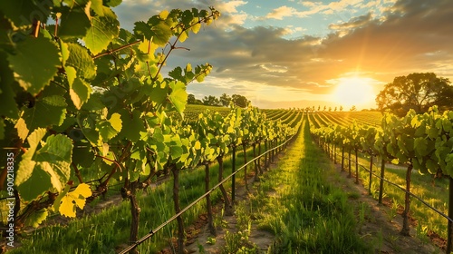 Fototapeta premium A scenic vineyard with rows of grapevines under a golden sunset, representing...