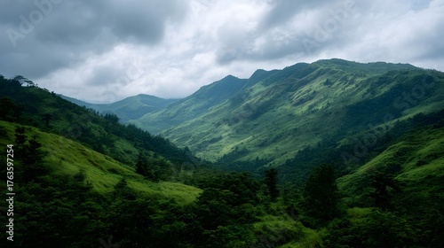 © Thares2020, Fototapeta premium A scenic vista of lush green mountains and valleys under a dramatic overcast sky