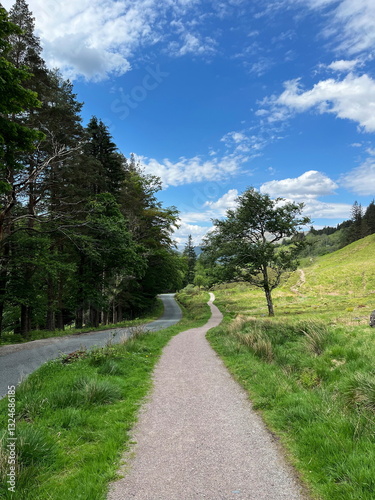 © Iuliia, Obraz premium A scenic walking path in Glencoe, Scotland, surrounded by lush greenery and green fields on a bright spring day.