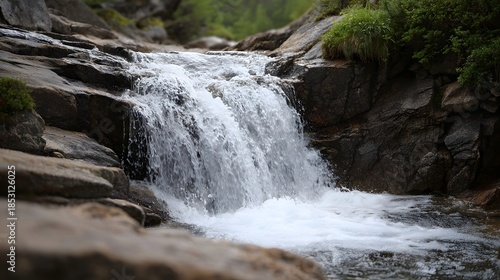 © Thares2020, Fototapeta premium A scenic waterfall cascades over rough rocks in a tranquil natural landscape