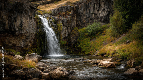 © Jhati, Obraz premium A scenic waterfall cascading down rocky cliffs into a stream with lush greenery