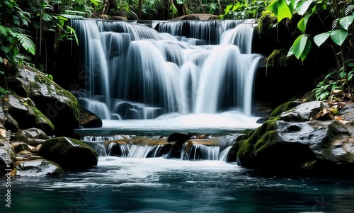 © YiuCheung, Fototapeta premium A scenic waterfall gracefully descends over moss covered rocks into a calm pool, surrounded by vibrant green foliage in a peaceful forest.