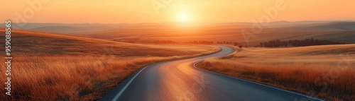 Naklejka premium A scenic winding road under a beautiful sunset, surrounded by golden fields and rolling hills, perfect for travel and adventure.