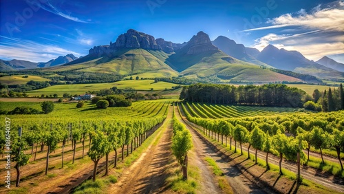 Fototapeta premium A scenic wine vineyard in Stellenbosch, Cape Town on a sunny day , wine, vineyard, Stellenbosch, Cape Town, sunny