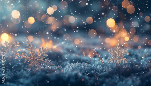 © mankjon, Obraz premium A Scenic Winter Background Depicting Intricate Snowflakes Glittering Amongst Softly Falling Snow Under a Mystical Moonlit Sky with Warm Bokeh Lights