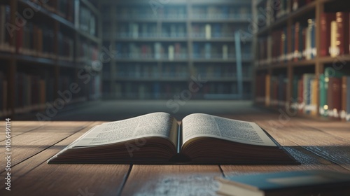 Fototapeta premium 2410 37.A school library scene with an open book laid out on a wooden table, its pages spread wide. In the background, rows of bookshelves filled with neatly arranged books in different colors are