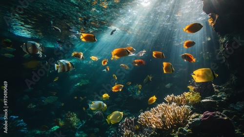 Naklejka premium A school of bright tropical fish swimming near a coral reef, with various...