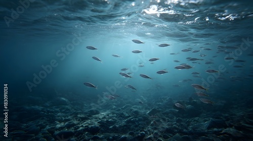 Fototapeta premium A school of fish swims gracefully through clear blue ocean water illuminated...