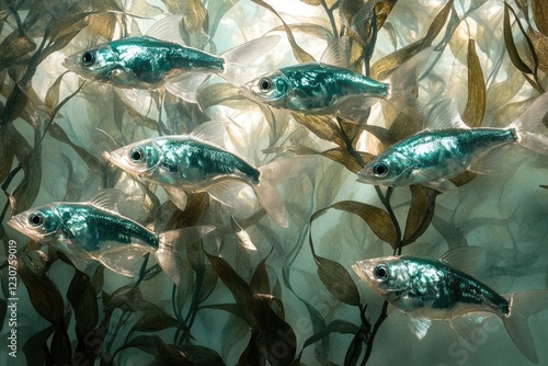 Fototapeta premium A school of iridescent fish gracefully swim amidst kelp forest, creating an...
