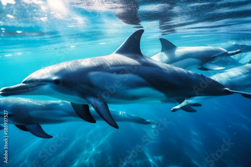 © Nilima, Obraz premium A school of playful dolphins racing through the waves under a cloudless sky