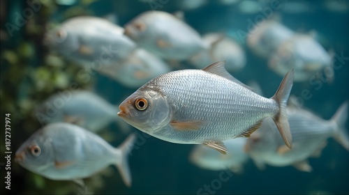 Fototapeta premium A school of shimmering silver fish gracefully swims in clear blue underwater