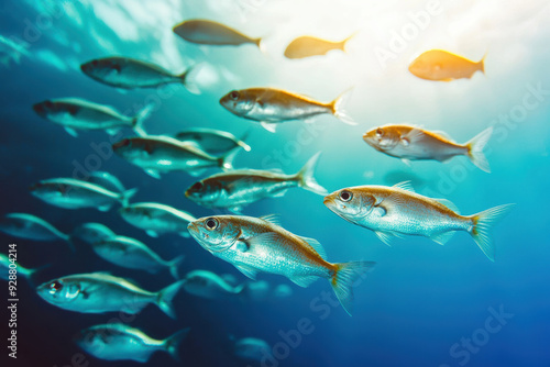 Naklejka premium A school of silver fish swimming gracefully underwater in the clear blue ocean, sunlight filtering through the water, highlighting their scales.