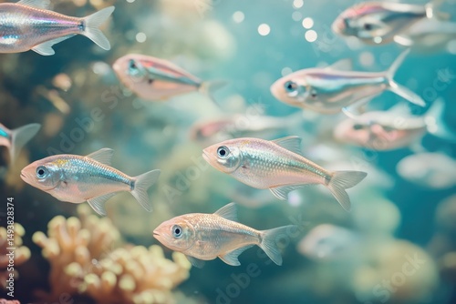 Naklejka premium A school of silvery fish swim gracefully in a clear aquarium, their scales...