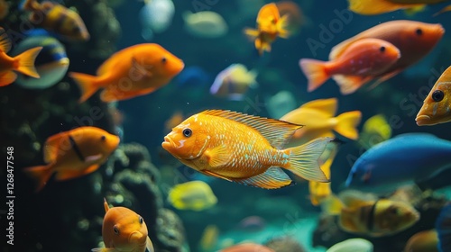 Fototapeta premium a school of tropical fish, showcasing their vibrant colors and intricate...