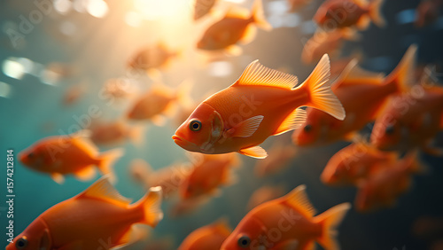 Fototapeta premium A school of vibrant goldfish swimming gracefully in clear water illuminated...