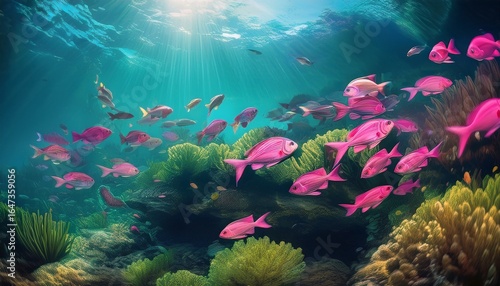 © Cristina, Fototapeta premium a school of vibrant pink fish swim in a lush green underwater paradise