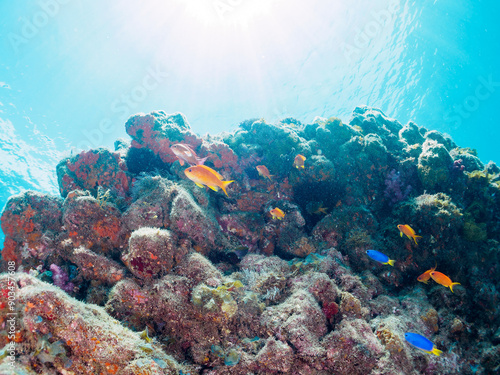 Naklejka premium キンギョハナダイ(ハナダイ亜科)、ソラスズメダイ(スズメダイ科)他の群れ。日本国静岡県伊豆半島賀茂郡南伊豆町中木から渡し船で渡るヒリゾ浜-2024年7月A schools of Sea Goldie (Pseudanthias squamipinnis), Heavenly Damselfish (Pomacentrus coelestis), and others.