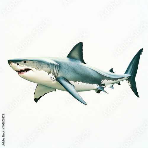 Naklejka premium A scientific-style photograph of a great white shark in a lateral view, set against a pure white background.