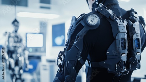 Fototapeta premium A scientist testing advanced exoskeleton suits for enhanced mobility, spacious biomechanics research lab with futuristic gear, High-tech style